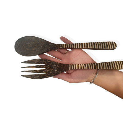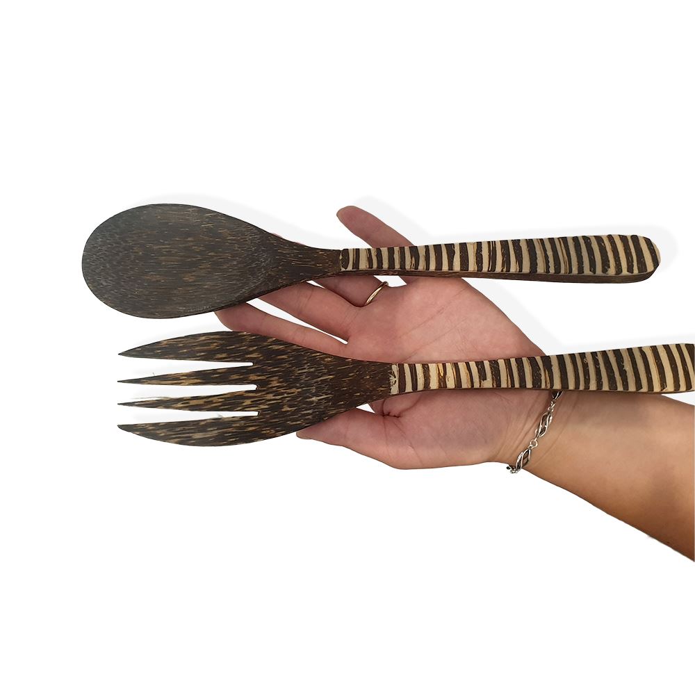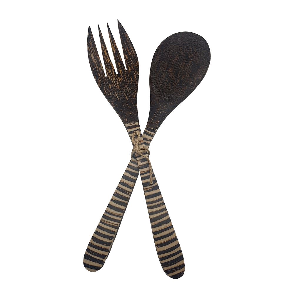 The Sono Wood Salad Servers - Stripe Pattern consists of a salad fork and a salad spoon. Natural and made from sustainable sources, they have a beautiful, distinctive grain and colour. It can be used for outdoors, picnics, entertainment and much more. With the appropriate care can last a lifetime. Do not soak in water or put in the dishwasher. Wash with warm, soapy water and dry immediately.